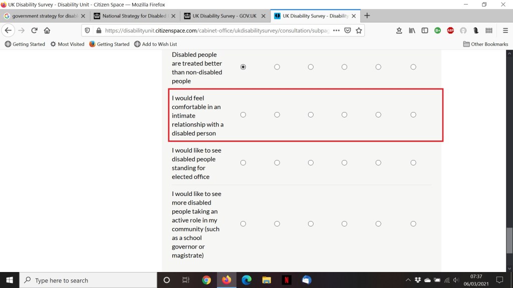 Despite my reservations, I decided to look into this new strategy proposal. The accompanying survey was issued to meet one of the criterions of the strategy, which is ‘to build on evidence and data, and critically on insights from the lived experience of disabled people.’ Now this I like, at least in theory. The Facebook post I mentioned earlier related directly to this very survey. To verify the post, which objected to a question asked of participants, I completed the survey myself, and anyone else can as well (see reference 4 at the end of this article). Let us deal with the objection first; here is the question that is being contested: