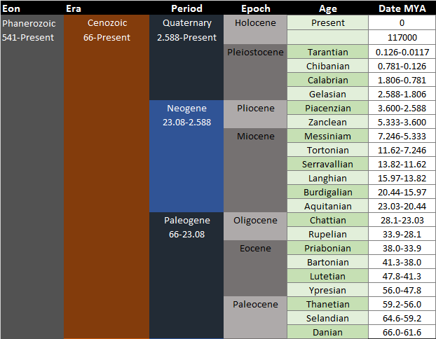 The History of the Earth is some 4.6 billion years old. It is a length of time that is difficult to comprehend. Scientists divide this extensive history into five distinct groups to make it easier to understand. First, there is the Eon, which is the largest segment of time, next is the Era, then the Period, followed by the Epoch, and finally the Age. For illustrative purposes, the dinosaurs lived, thrived, and died during the Mesozoic Era, which was divided up into the Triassic, Jurassic, and Cretaceous Periods. We are living in the Cenozoic Era, which is also divided into three periods, the Paleogene, the Neogene, and the Quaternary, the latter being the period that is continuing today.