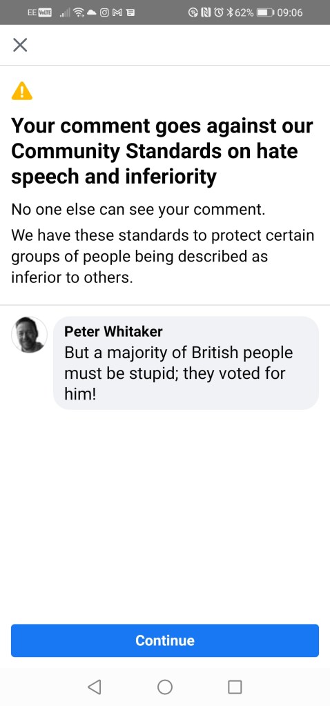 The subject of the post was the ineptitude of the British Government and how could anyone of voted for a man who is a known liar and totally incompetent, that is Boris Johnson. Brave Facebook decided to intercede to protect this group of people, the majority of the British electorate, from being described as inferior to others. I did not describe them as inferior, I said that they were stupid and I was using the word to imply that they had shown poor judgment, which is a valid definition of the word, stupid.