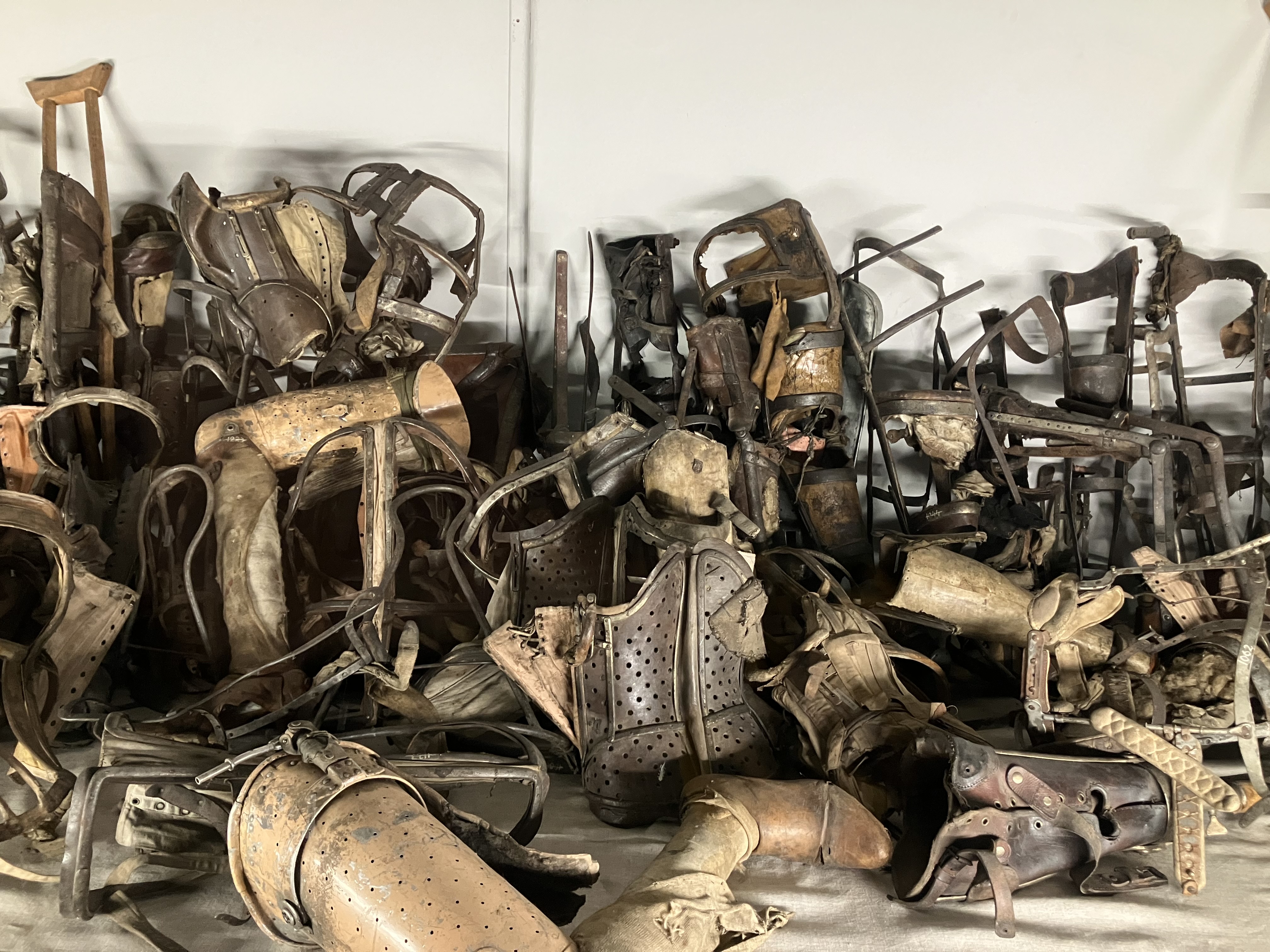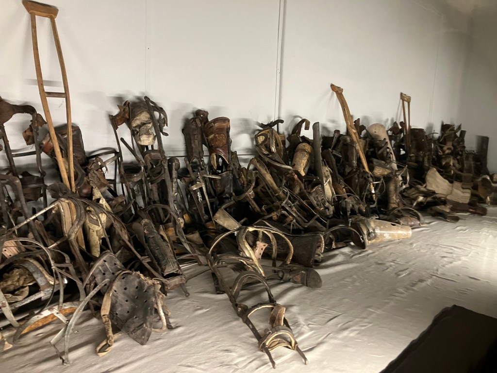 When I posted this comment on social media several responses suggested that the Nazis had not intended it Auschwitz to be accessible to disabled people. That is probably true, but the camp today does not exist to fulfil the function that the Nazis intended when they converted what was then a barracks for a Polish cavalry regiment into a concentration camp and, later, a death camp. Our guide told us that throughout its use by the Nazis the camp was changed and adapted to use almost constantly. This made me wonder why it has not been further adapted to allow disabled people to visit it today. Only a small number of the buildings are open to the public so any changes to them to allow disabled visitors access would not change the camp itself to any marked degree. In one of these buildings there is an exhibit, upstairs ironically enough, of some of the orthotic equipment taken from inmates who were killed in Auschwitz. The number of these victims is estimated at 100,000, but our guide told us that the real figure is probably much higher as the Nazis did not bother keeping an accurate account. Although the disabled were amongst many other groups that were sent to death camps like Auschwitz the real focus, and that of historians afterwards, has been on the murder of the Jewish people, but the fact is that the enforced euthanasia of undesirables began in September 1939 with the German population of disabled people, more of which you can read here: Life Unworthy of Life – The Euthanasia of the Disabled in Nazi Germany | Peter C Whitaker