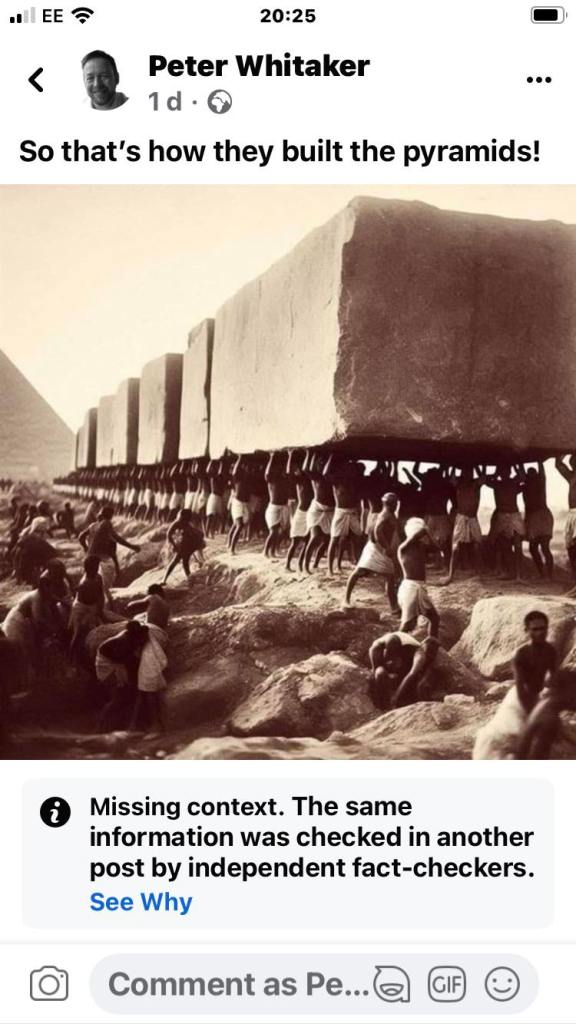 I recently shared a meme on Facebook simply because it made me laugh. It was a photograph that purported to be of workers building the Egyptian pyramids. There has been a lot of speculation over many years as to how the ancient Egyptians completed these colossal structures, and some wit decided to answer the question with a clearly invented picture that was just as clearly intended to be a joke, but it was one that Facebook did not get. After sharing the said post I received a warning from Facebook that it would be limited as ‘independent fact checkers’ had decided it ‘lacked context’!